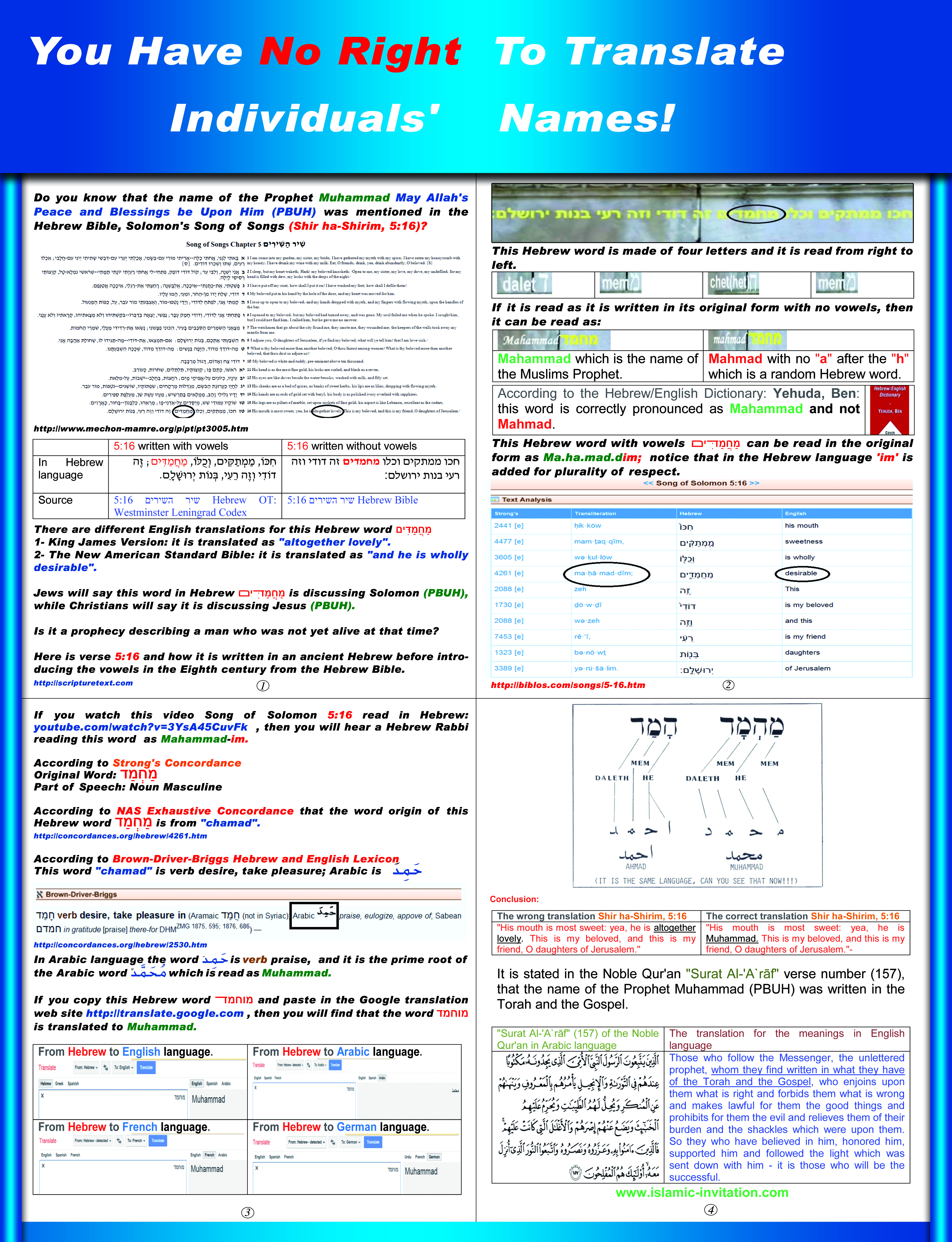 An interesting poster in English illustrates and proves in a simple way that the prophet Muhammad (peace and blessings of Allah be upon him) is explicitly mentioned in the Bible. The poster uses the Internet service "Google Translate" to prove this theory lest some people say Muslims try in a wrong way to prove the authenticity of their religion. Google Translate was presented by non-Muslim individuals and we do not think they make propaganda for Islam on their websites.